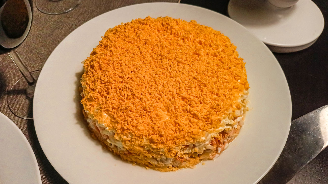 …опять майонез и венчают всё мелконатёртые яичные желтки.
